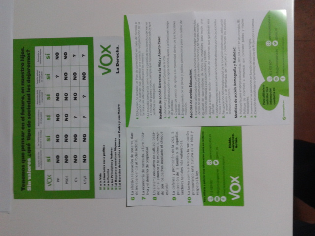 La nueva formación política Vox, que vuelve de nuevo a comparecer en las urnas con el eslogan de «la derecha», ha salido otra vez a las calles majariegas para intentar recuperar los 1.900 votos que obtuvo en las elecciones europeas de 2014 y que le darían entre 1 y 2 concejales, ya que los majariegos la convirtieron con sus sufragios en la cuarta fuerza política de la localidad. Representada por dos ciudadanos de diferente edad, los candidatos de Vox repartieron sus folletos con su programa en la Gran Vía. Estos son sus contenidos: