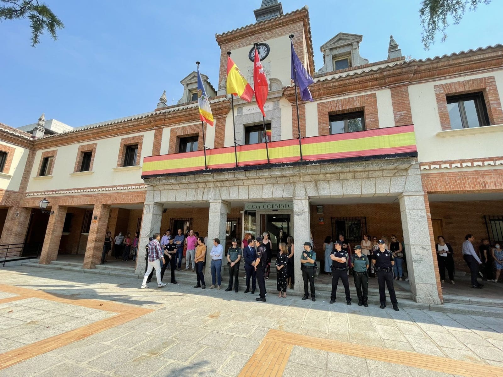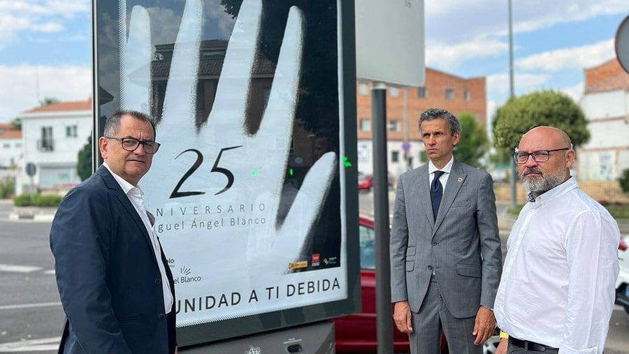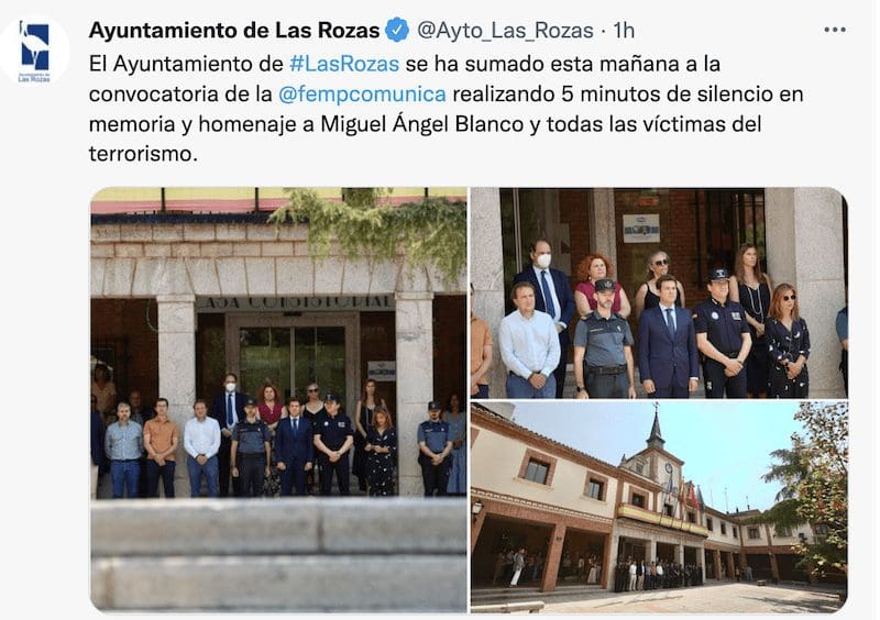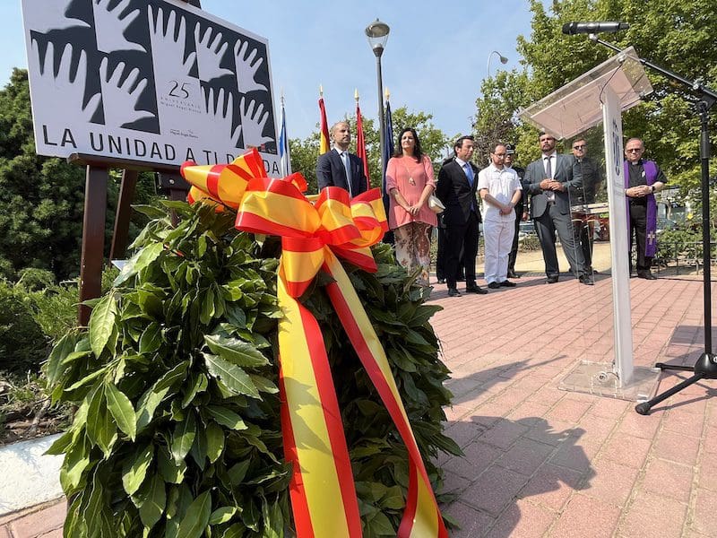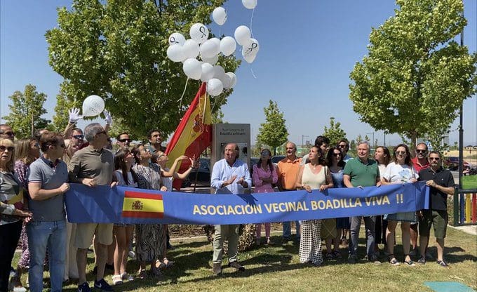BOADILLA PRESERVA LA UNIDAD HOMENAJEANDO A «TODAS LAS VICTIMAS». En Boadilla del Monte, el Ayuntamiento destacó: «Hoy se cumplen 25 años del asesinato de Miguel Ángel Blanco y con esta iniciativa hemos mostrado nuestra repulsa a cualquier clase de acto terrorista. En homenaje y reconocimiento a todas las víctimas del terrorismo, el alcalde Javier Ubeda, junto al equipo de gobierno, concejales de la oposición y vecinos, han guardado 5 minutos de silencio frente a la sede administrativa del Ayuntamiento». Vox Boadilla resaltó su presencia en este y otros actos: «Hoy hemos estado acompañando y apoyando a la Asociación Vecinal Boadilla Viva en el emotivo homenaje que han hecho a Miguel Ángel Blanco. ¡Ni olvido ni perdón!. ¡Con terroristas no se gobierna!».